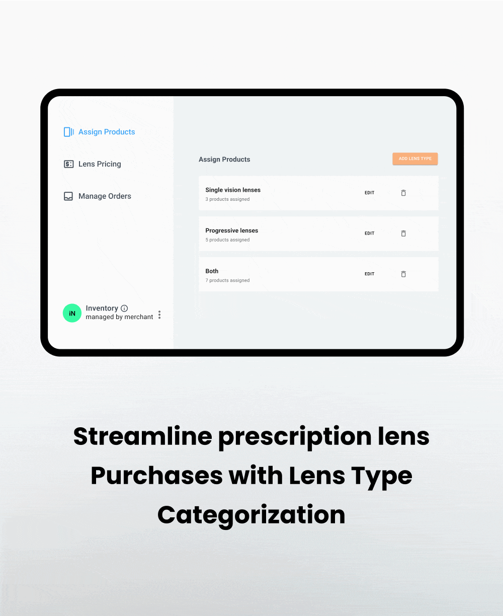 Sell prescription glasses, sunglasses, and contact lenses seamlessly through an online platform designed for ease and efficiency.